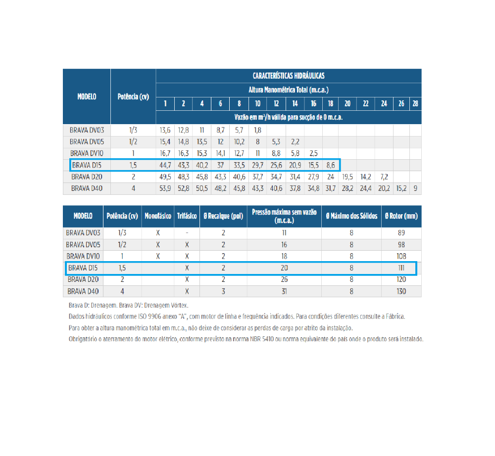 Instale a Série Brava de forma que o motor elétrico trabalhe completamente submerso. Os modelos que possuem boia elétrica para acionamento automático não devem operar em regime contínuo de funcionamento. Para o bombeamento em sistema contínuo é necessário a submergência total do produto.